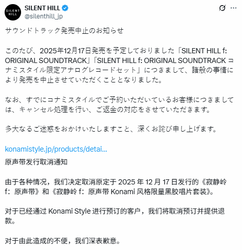 原定于2025年12月17日发售的《寂静岭f》原声带以及《寂静岭f》原声带-科乐美直营店限定黑胶唱片套装,因故决定终止发售。