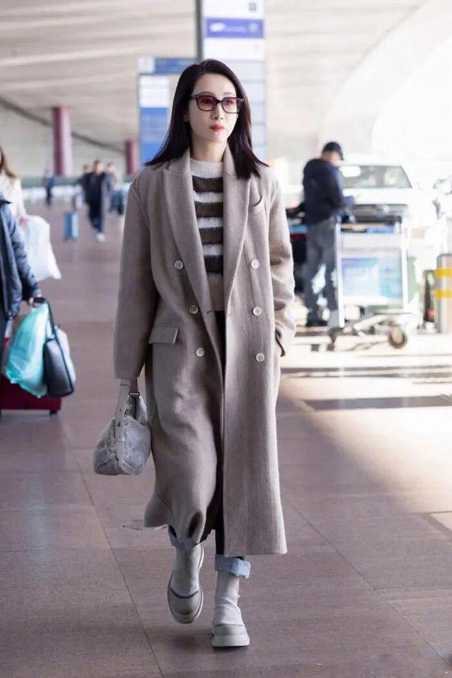 牛仔裤作为百搭单品,与燕麦色大衣和条纹毛衣的搭配非常和谐,既保留了休闲与舒适的感觉,又不失时尚感。这样的组合不仅适合日常出行,也能轻松驾驭各种场合,展现出秦海璐的自信与从容。