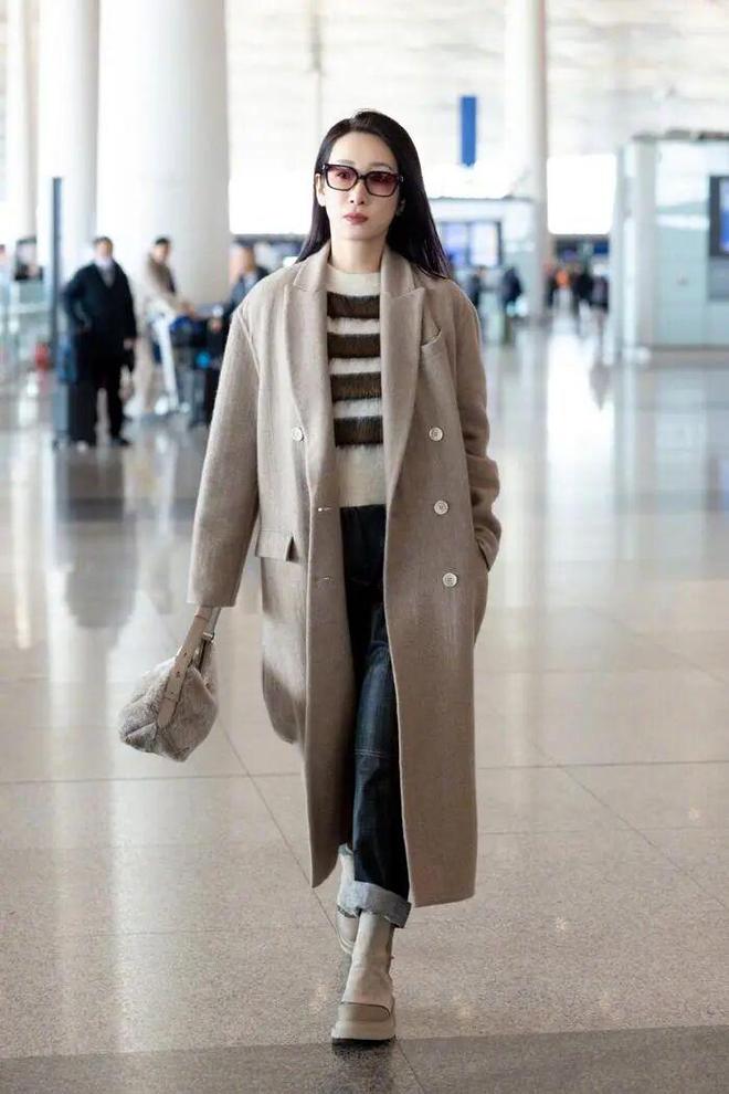 秦海璐以燕麦色大衣搭配条纹毛衣和牛仔裤的装扮,展现了一种低调而又不失格调的时尚感。燕麦色大衣以其柔和的色调和高级的面料,营造出一种温暖而优雅的氛围,非常适合秋冬季节穿着。