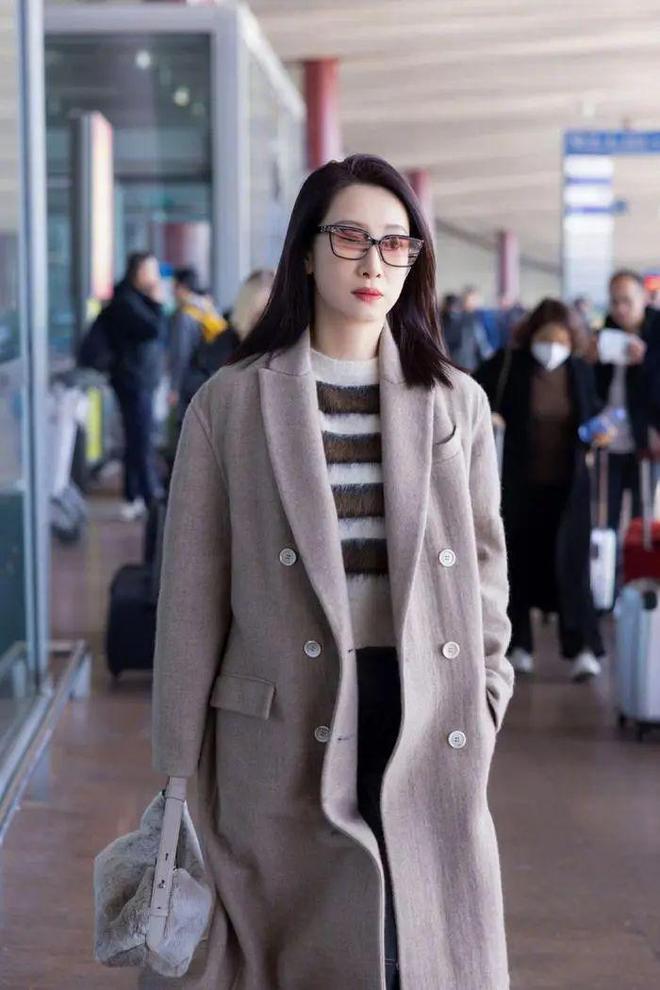 内搭的条纹毛衣则为整体穿搭增添了层次感和趣味性,条纹元素的运用让造型更加生动,同时也展现出了秦海璐的时尚品味。