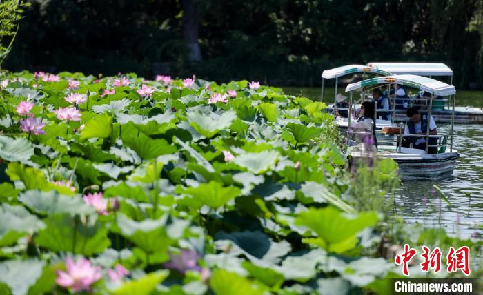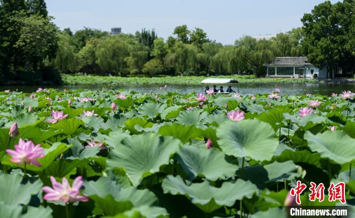 6月27日,山东济南大明湖公园里的荷花竞相绽放,吸引众多市民和游客前来观赏。图为游客乘船观赏荷花。中新社记者 张勇 摄