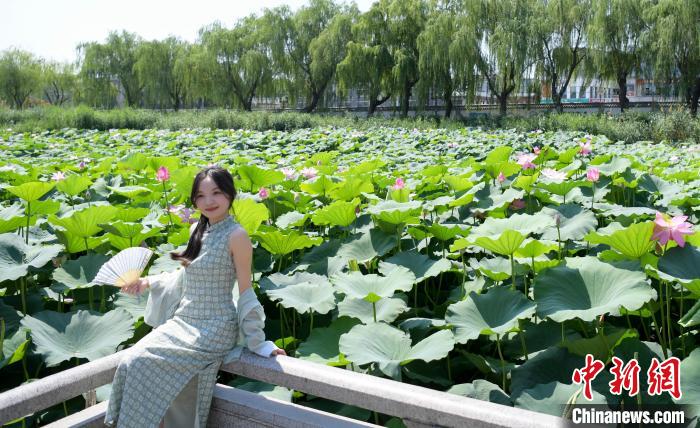 6月27日,山东济南大明湖公园里的荷花竞相绽放,吸引众多市民和游客前来观赏。图为游客在荷花前拍照留念。中新社记者 张勇 摄