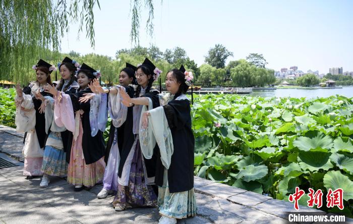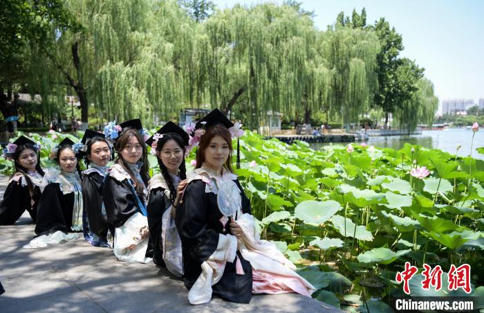6月27日,山东济南大明湖公园里的荷花竞相绽放,吸引众多市民和游客前来观赏。图为山东第一医科大学的大学生在荷花前拍毕业照。中新社记者 张勇 摄